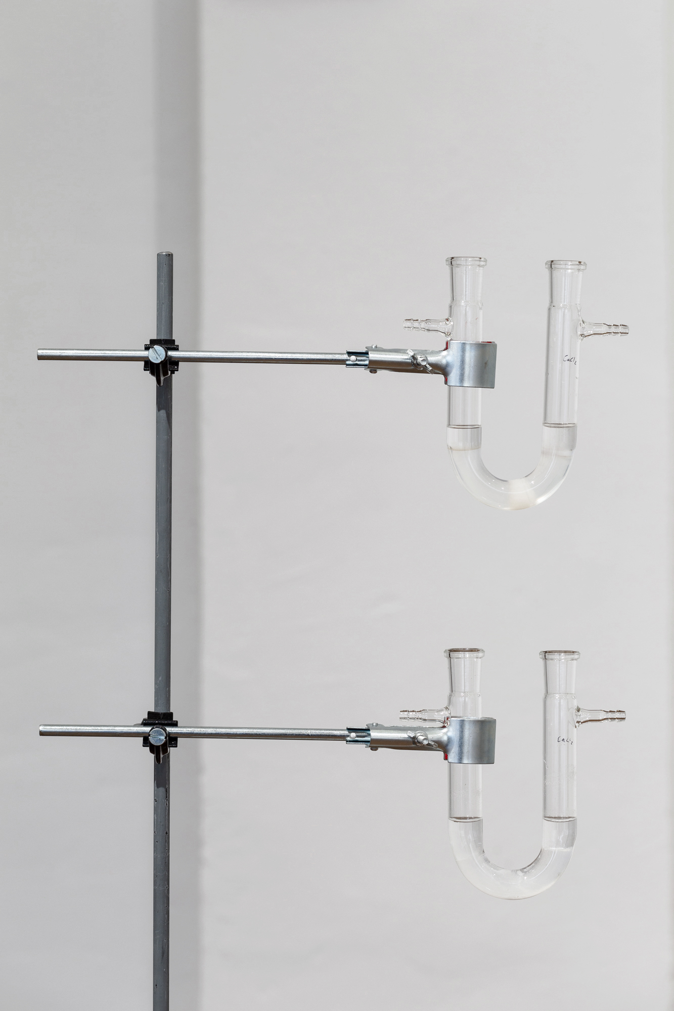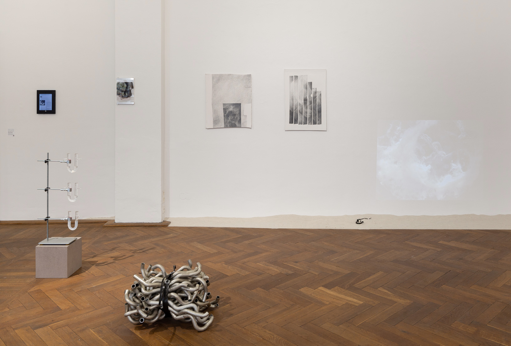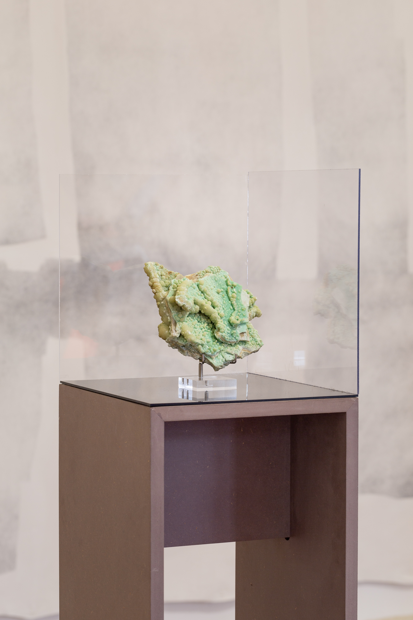 multi-part installation: microscope images, graphite on canvas, tidal sand, soil probe, mining slag, synthetic mineral, oxygen pipes, 2021