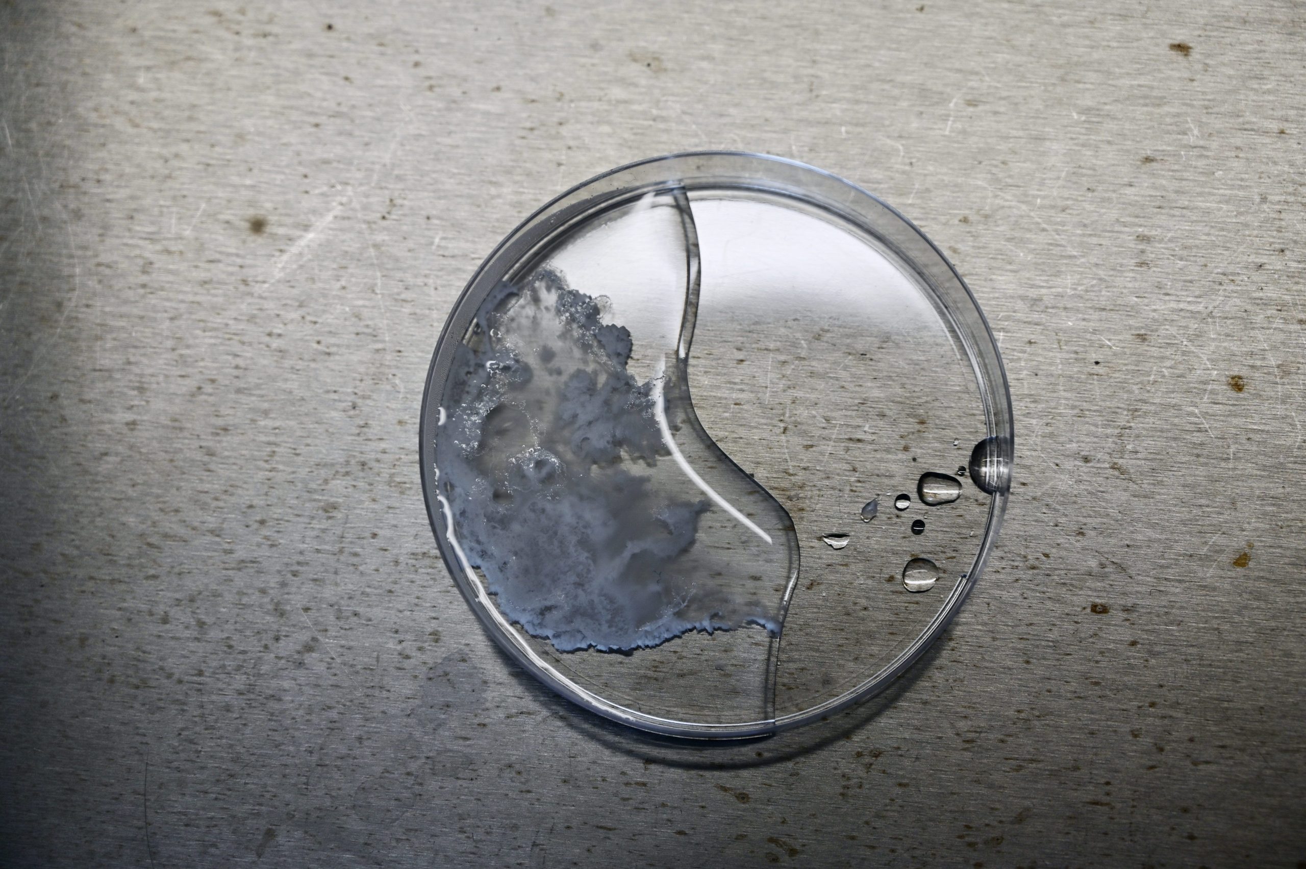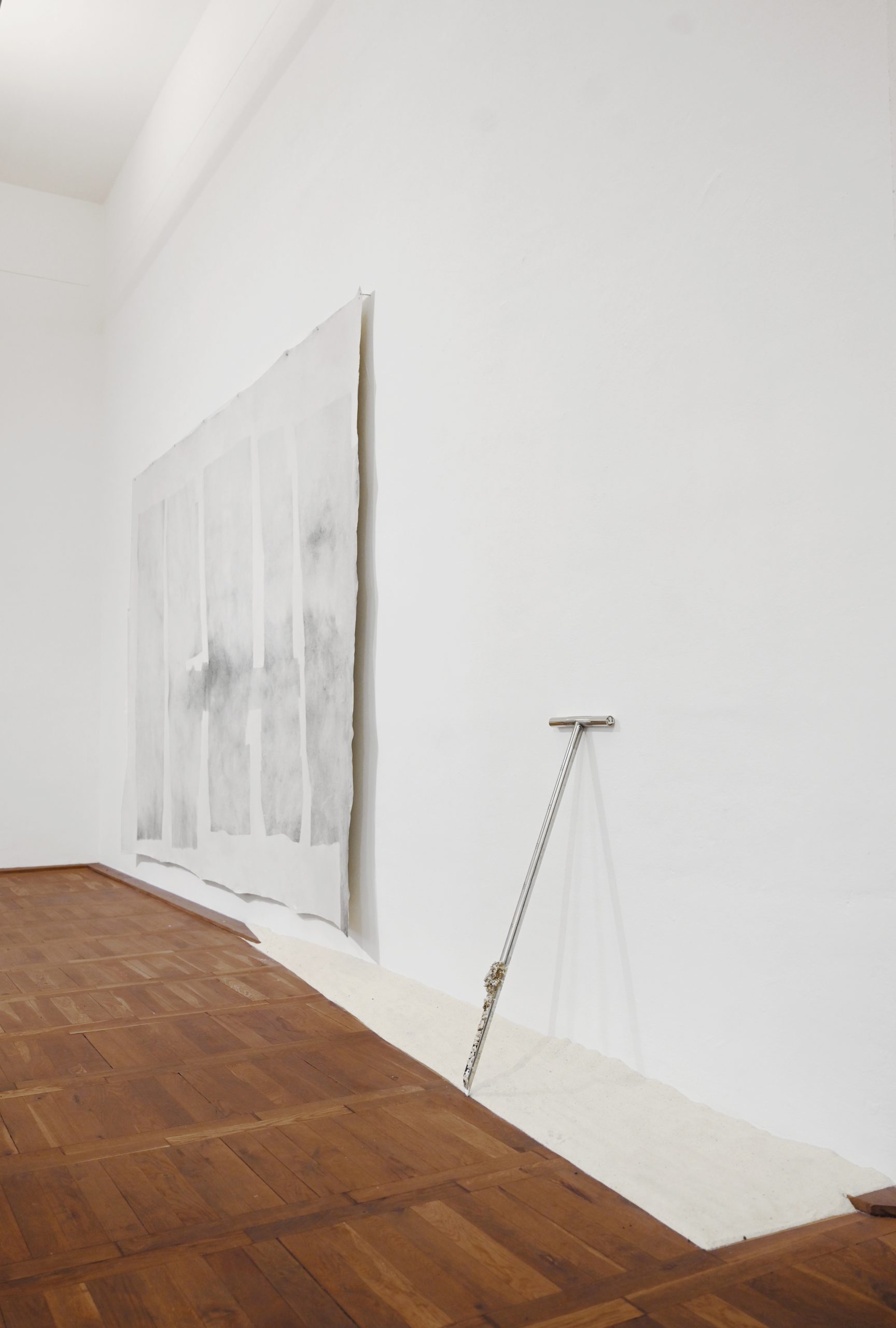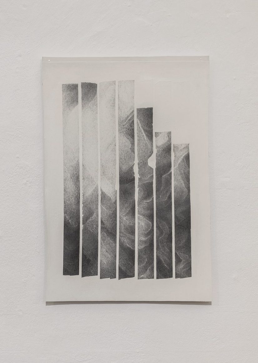 multi-part installation: microscope images, graphite on canvas, tidal sand, soil probe, mining slag, synthetic mineral, oxygen pipes, 2021
