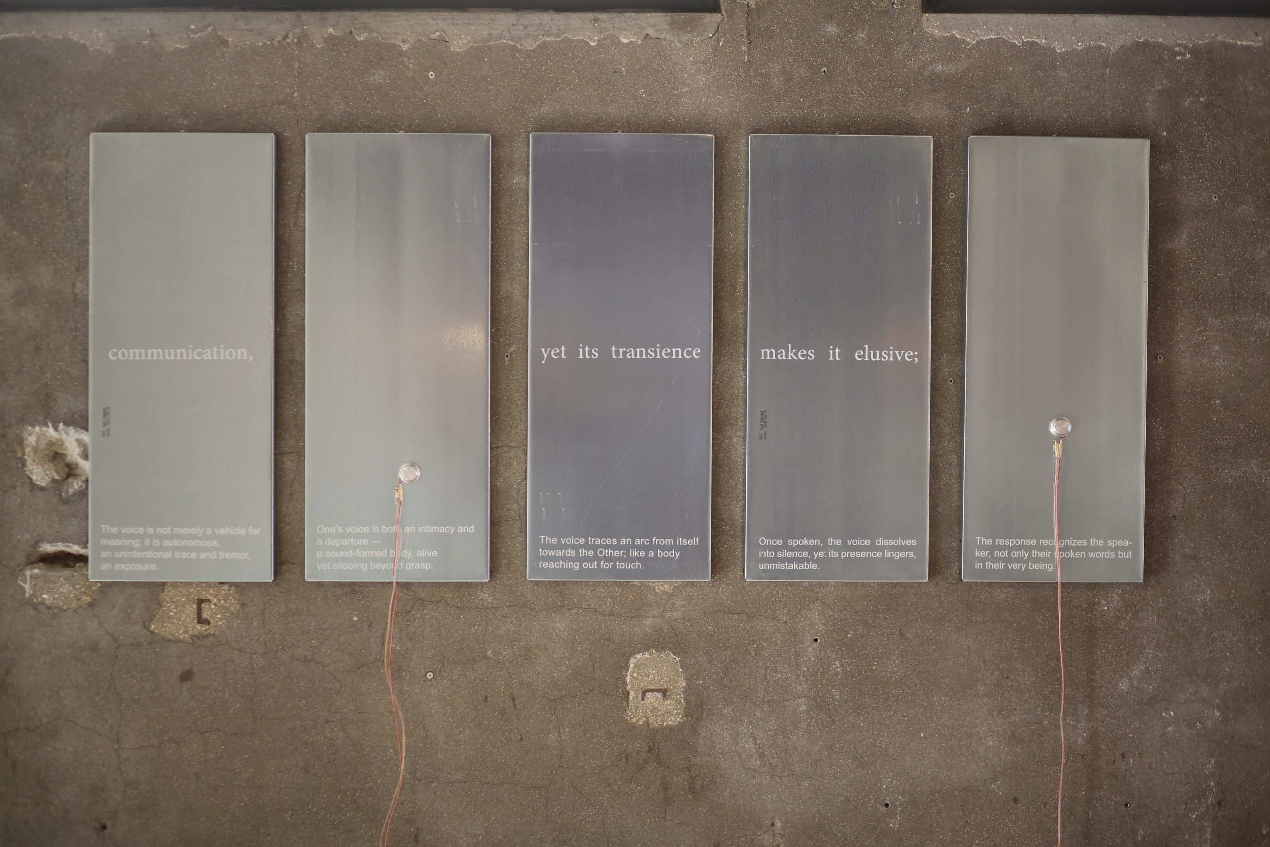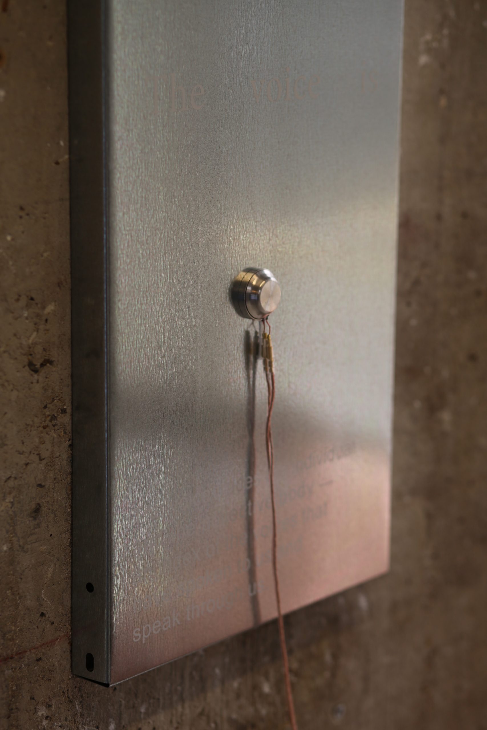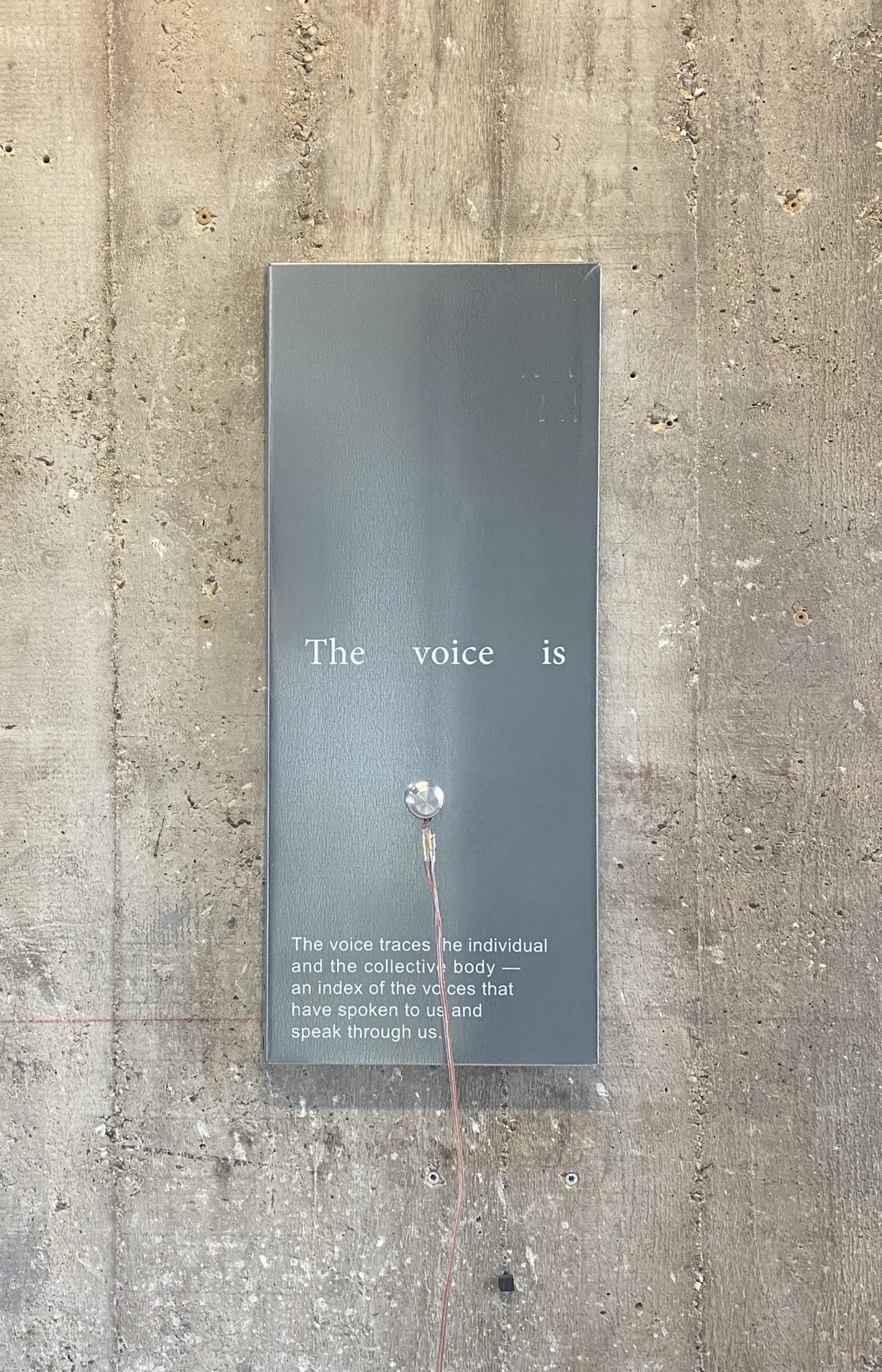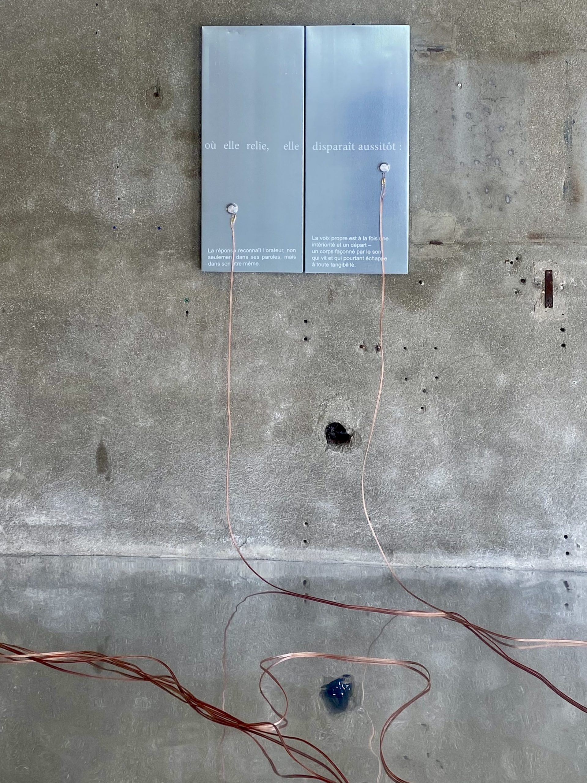 Margarita Wenzel explores how synthetic voices shape our perception of intimacy, authenticity, and collectivity. In Virtual Voiɔɘƨ, she weaves together vocal technologies and affective narratives to question the boundaries between body and machine, presence and absence. Drawing on vocal exercises transformed into AI instructions, the artist clones, fragments, and distorts her own voice to compose a hybrid, glitched, and unsettling soundscape. Installed in situ, the work unfolds through vibrating speakers, creating an immersive listening experience enhanced by orange lighting and a silver floor. Interlacing text and voice, the piece raises a fundamental question: who owns a voice once it becomes digital data? Copper, present in the installation, functions both as an ancient mirror and a technological material, linking these floating voices to the history of reflection, language, and extraction. Virtual Voiɔɘƨ probes our relationship to the voice in the age of artificial intelligence — suspended between the erasure of the body and the persistence of the sensorial.