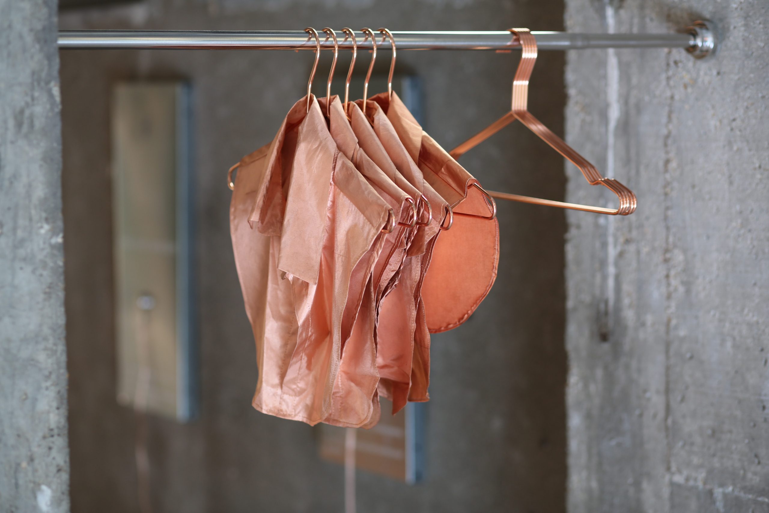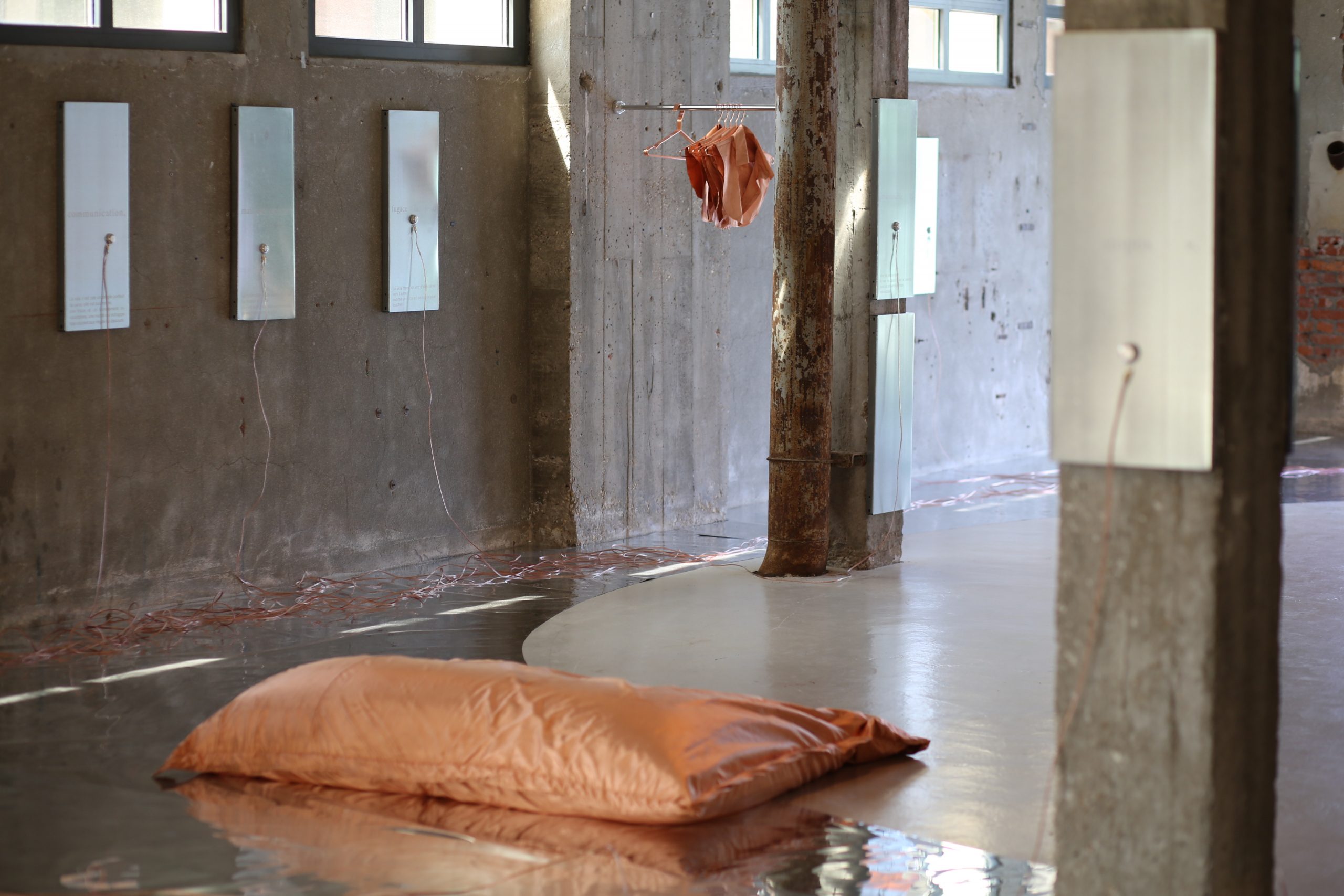 Spatial installation incorporating resonance speakers, copper cables, shielding garments, a mirror floor, reflecting metal elements, and text